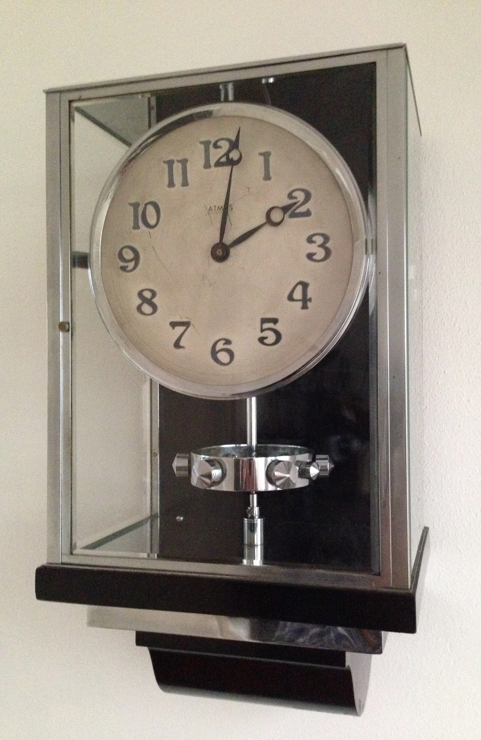 W35 Large nickel plated Art Deco J. L. Reutter Wall Hanging Three-Glass Atmos Clock. € 15500 $ 18217 £ 13544 ¥ 2821775 DKK 115811 CHF 14134 NOK 174422 CA$ 24966 HK$ 142361